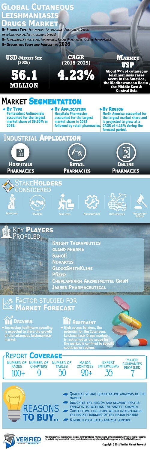 Global Cutaneous Leishmaniasis Drugs market was valued at USD 40.5 Million in 2018 and is projected to reach USD 56.1 Million by 2026, growing at a CAGR of 4.23% from 2019 to 2026.