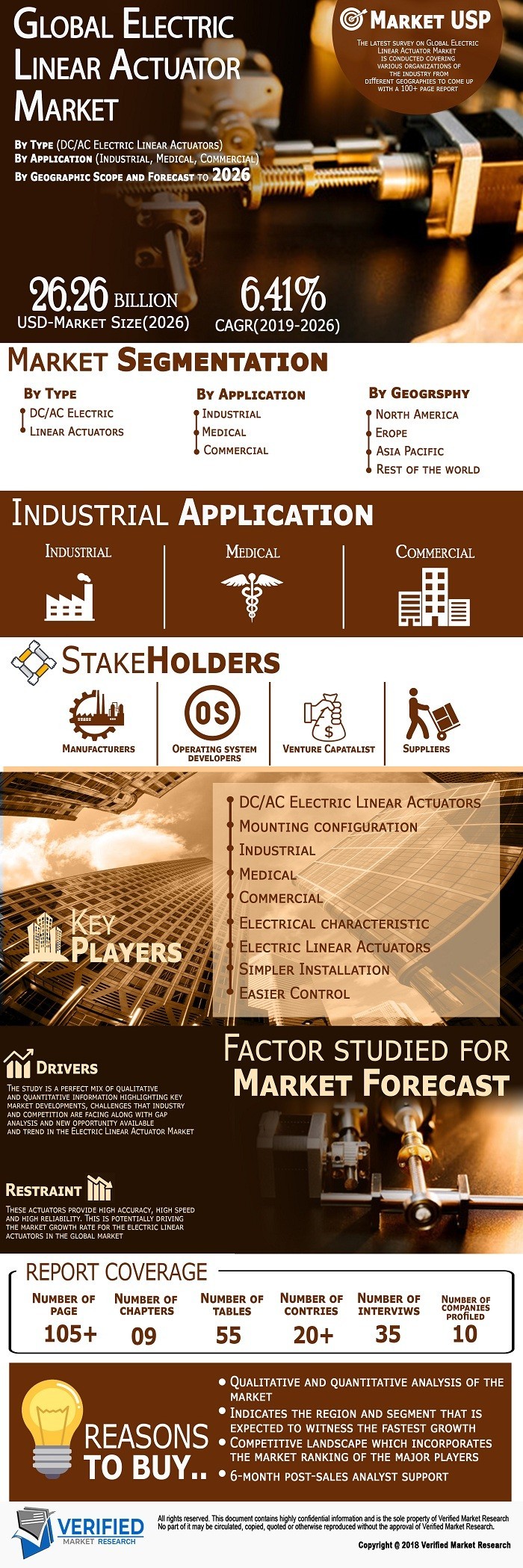 Electric Linear Actuator Market was valued at USD 16.13 Billion in 2018 and is expected to witness a growth of 6.41% from 2019-2026 and reach USD 26.26 Billion by 2026.
