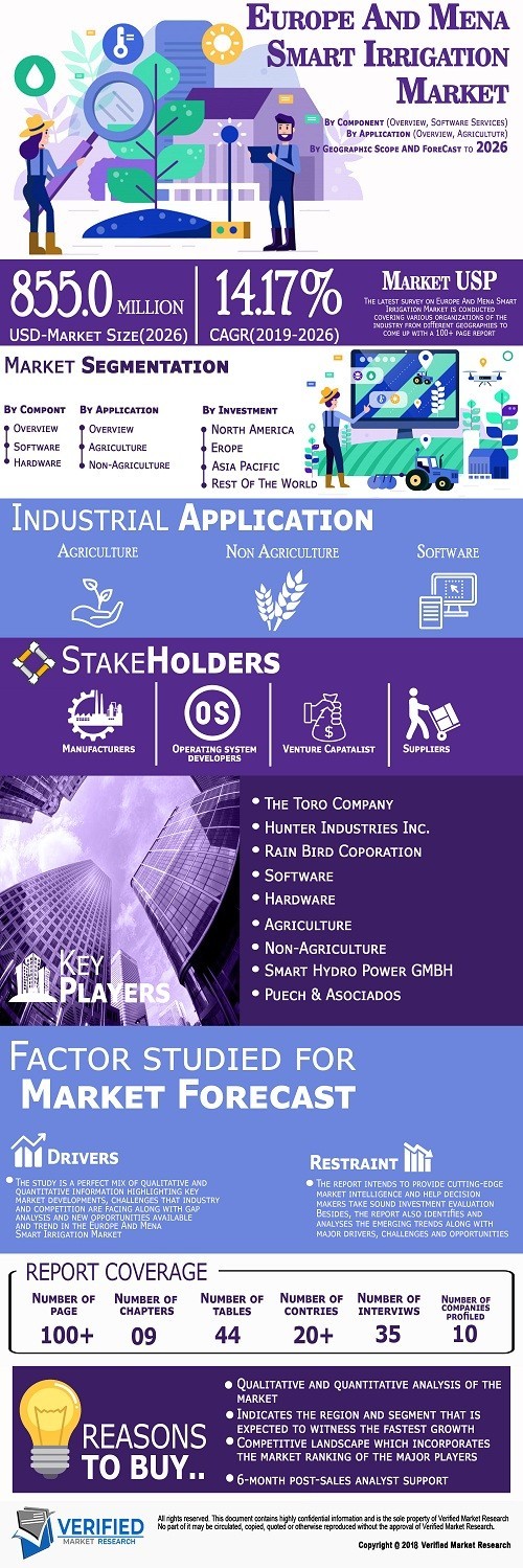According to Verified Market Research, Europe And Mena Smart Irrigation Market was valued at USD 302.3 Million in 2018 .
