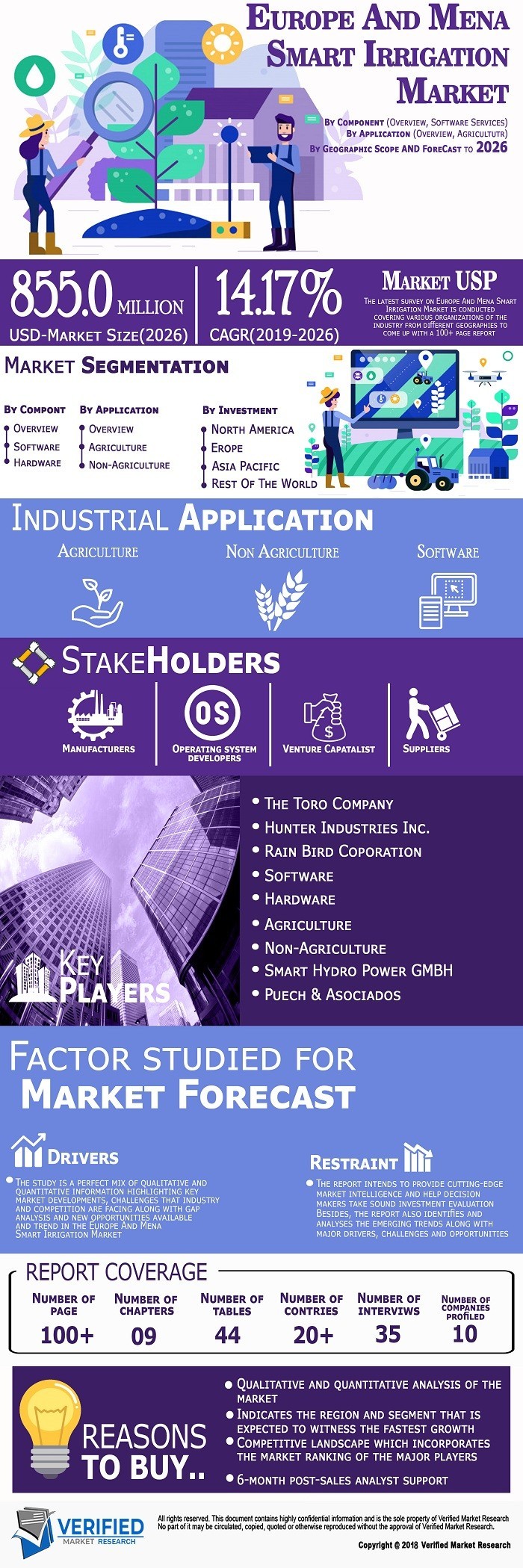 Europe And Mena Smart Irrigation Market was valued at USD 302.3 Million in 2018 and is expected to witness a growth of 14.17% from 2019 to 2026 and is expected to reach USD 855.0 Million by 2026.