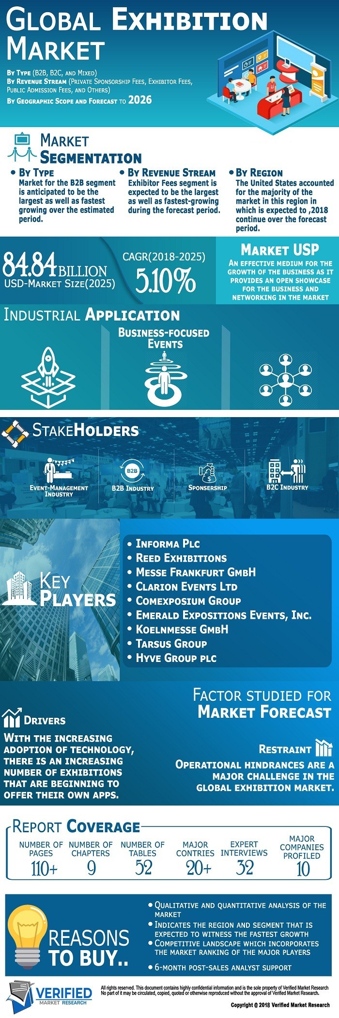 According to Verified Market Research, The Global Exhibition Market was valued at USD 57.40 Billion in 2018 and is projected to reach USD 84.84 Billion by 2026, growing at a CAGR of 5.10% from 2019 to 2026.