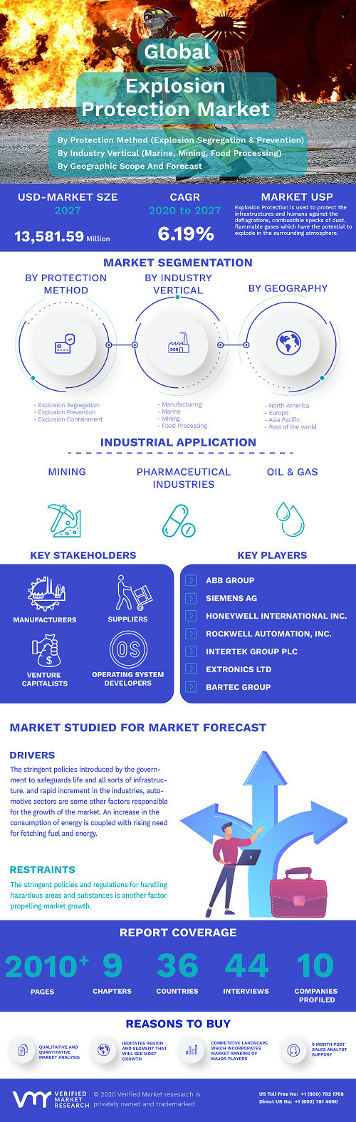 News Explosion Protection Market Size By Protection Method, By Industry Vertical, By Geographic Scope And Forecast smithjenny22119 917 views Explosion Protection Market was valued at USD 9,076.41 Million in 2019 and is projected to reach USD 13,581.59 Million by 2027. « Previous Explosion Protection Market