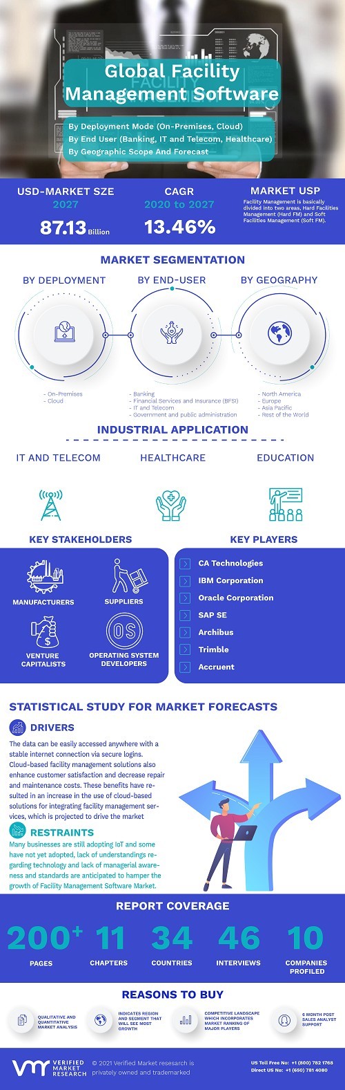 News Facility Management Software Market Size By Offering, By Deployment Mode, By End User, By Geographic Scope And Forecast smithjenny22119 1,167 views Facility Management Software Market was valued at USD 37.81 Billion in 2019 and is projected to reach USD 87.13 Billion by 2027, growing at a CAGR of 10.94% from 2020 to 2027. « Previous Facility Management Software Market