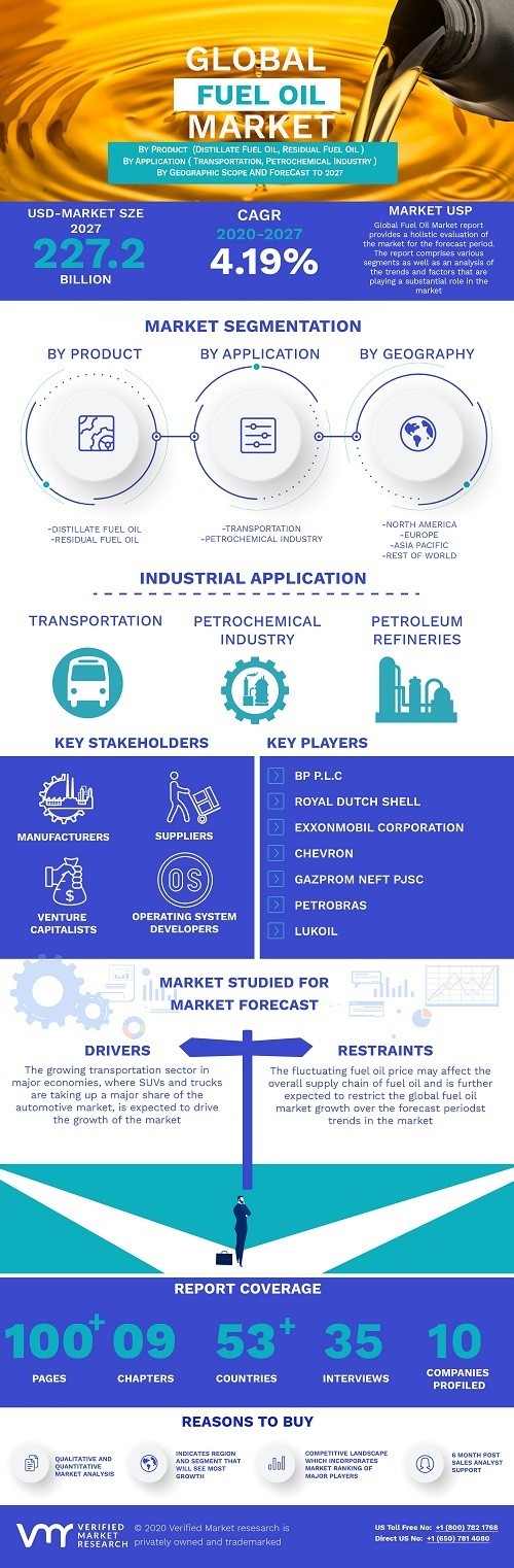 According to Verified Market Research, The Global Fuel Oil Market was valued at USD 163.3 Billion in 2019 and is projected to reach USD 227.2 Billion by 2027, growing at a CAGR of 4.19% from 2020 to 2027.