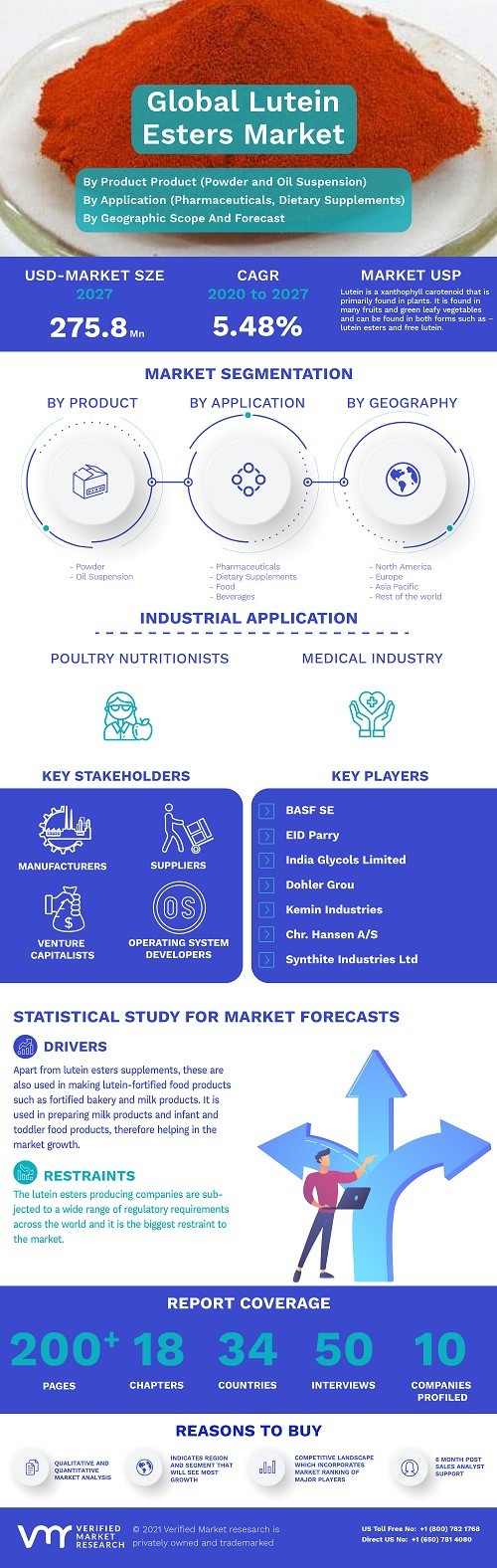 News Lutein Esters Market Size By Product, Application smithjenny22119 866 views Global Lutein Esters Market was valued at USD 193.5 Million in 2019 and is projected to reach USD 275.8 Million by 2027, growing at a CAGR of 5.48% from 2020 to 2027. « Previous Lutein Esters Market