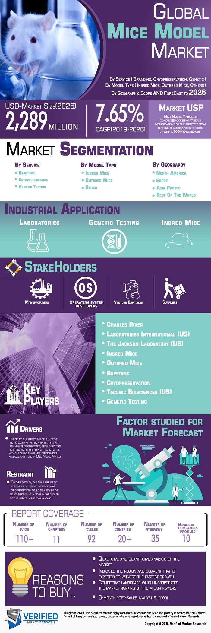 According to Verified Market Research, the Global Mice Model Market was valued at USD 1,282.7 Million in 2018 and is expected to witness a growth of 7.65% from 2019-2026 and reach USD 2,289.5 Million by 2026.