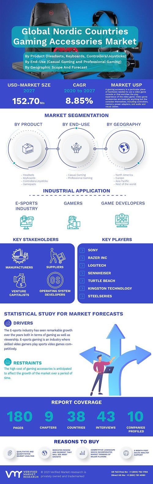 Nordic Countries Gaming Accessories Market Size By Product (Headsets, Keyboards, Controllers/Joysticks, Gamepads, Virtual Reality [VR] Devices, Mice, and Others), By End-Use (Casual Gaming and Professional Gaming), By Geograp
