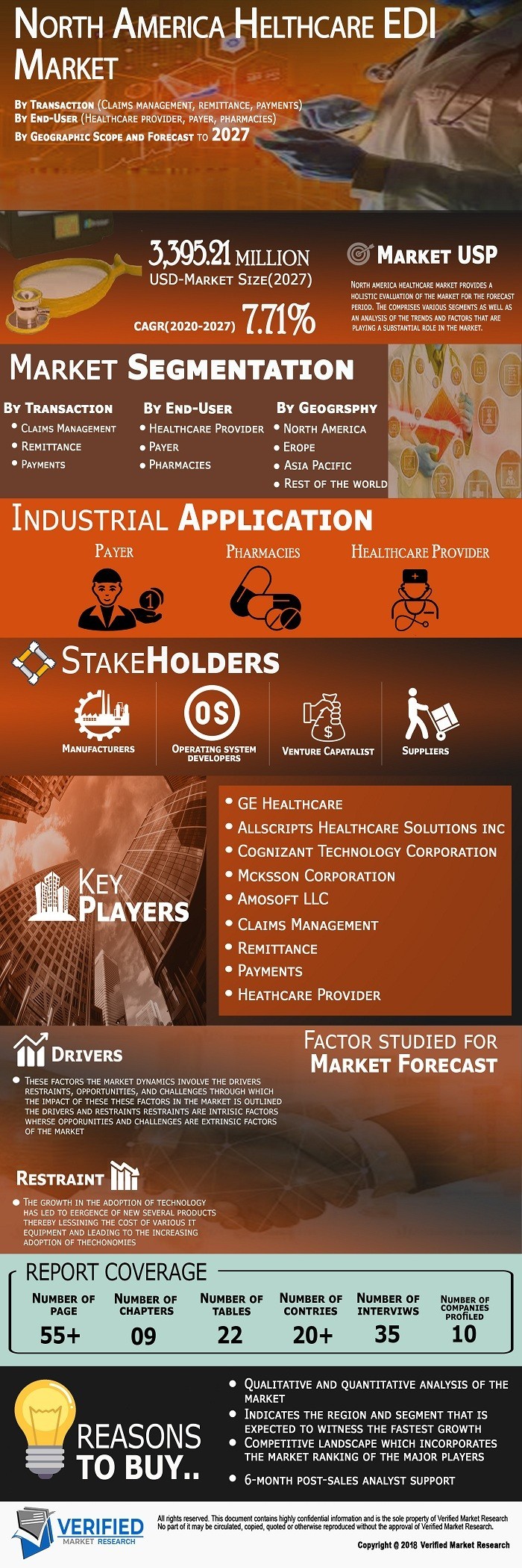 According to Verified Market Research, The North America Healthcare EDI Market was valued at USD 1,889.33 Million in 2019 and is projected to reach USD 3,395.21 Million by 2027, growing at a CAGR of 7.71% from 2020 to 2027.