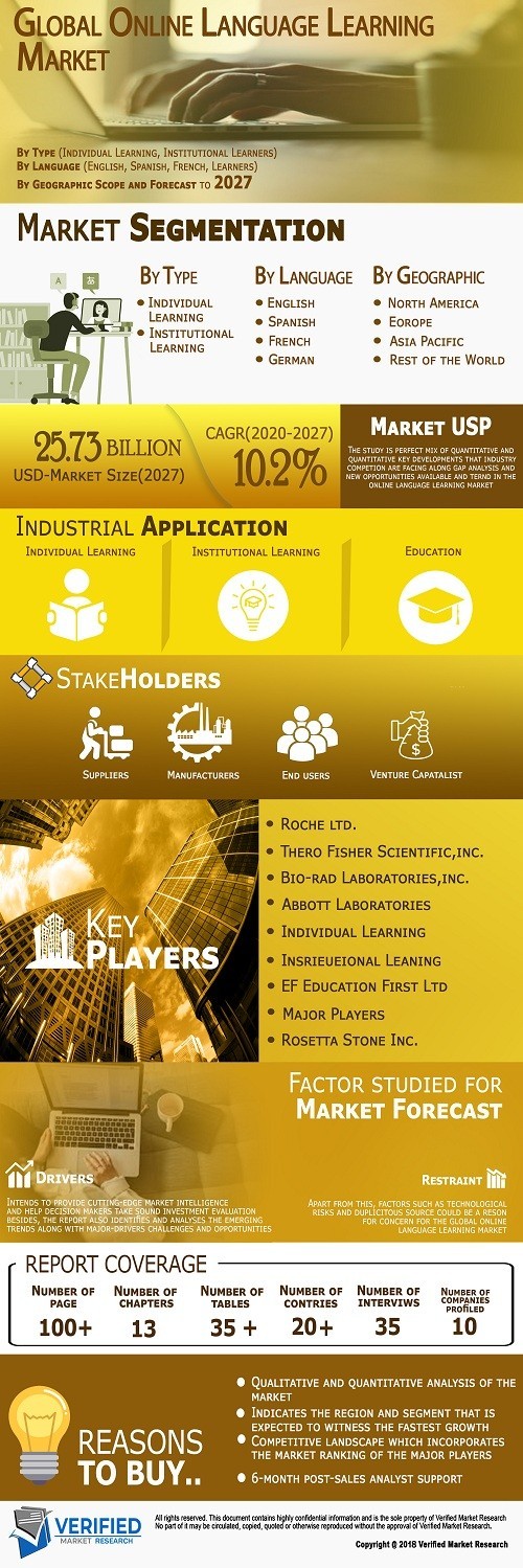 Online Language Learning Market was valued at USD 12.49 Billion in 2019 and is projected to reach USD 25.73 Billion by 2027, growing at a CAGR of 10.2% from 2020 to 2027.