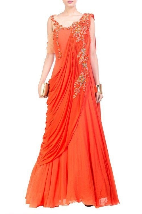 Saree Gown is best for wedding party and easy to wear. if you are looking traditional look in latest fashion must be try once. saree gown enhance your personality and look elegant.