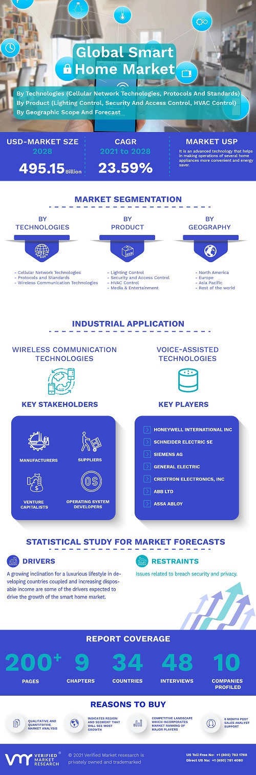 News Smart Home Market Size By Technologies, By Product(Lighting Control, Security And Access Control, HVAC Control), By Geographic Scope And Forecast smithjenny22119 1,351 views Smart Home Market size was valued at USD 98.24 Billion in 2020 and is projected to reach USD 495.15 Billion by 2028, growing at a CAGR of 23.59% from 2021 to 2028. « Previous Smart Home Market