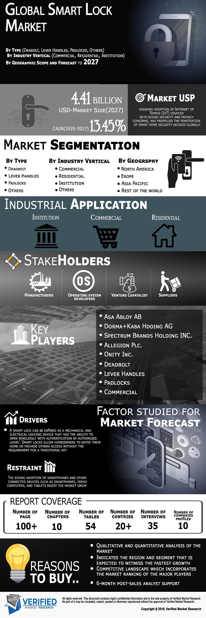 Smart Lock Market was valued at USD 1.74 billion in 2019 and is projected to reach USD 4.41 billion by 2027, growing at a CAGR of 13.25% from 2020 to 2027.