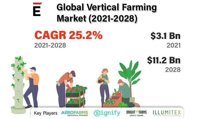 The global vertical farming market was valued at USD 3.1 Bn in 2021. The market is projected to grow USD 11.2 Bn in 2028, at a CAGR of 25.2%. Cannabis growing through vertical farming and potential market prospects in Asia Pacific and the Middle East is likely to grow the market share of global vertical farming market. Because the top key players in the industry are active in this sort of farming, the building-based vertical farms sector dominates the vertical farming market. Building-based vertical farms generate higher revenue per square foot than shipping container-based vertical farms since the former requires less capital and has lower running costs. The rise in popularity of organic food, optimum use of vertical space and balanced energy use, ease of crop monitoring and harvesting, and decline in arable land are all key elements influencing the vertical farming market's growth. However, the market's growth is hampered by large initial investments and the use of emerging technology. Nonetheless, the vertical farming sector is likely to benefit from rising urban populations and increased acceptance of technology-driven agriculture.
