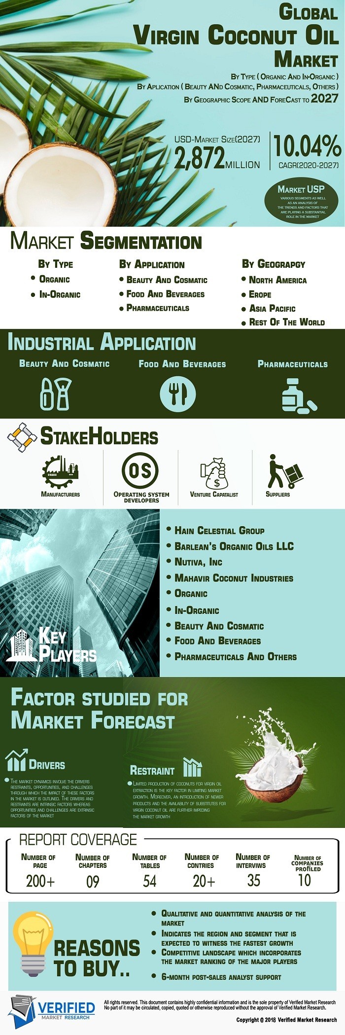 According to Verified Market Research, the Global Virgin Coconut Oil Market was valued at USD 1,280.6 Million in 2019 and is projected to reach USD 2,874.9 Million by 2027, growing at a CAGR of 10.04% from 2020 to 2027.
