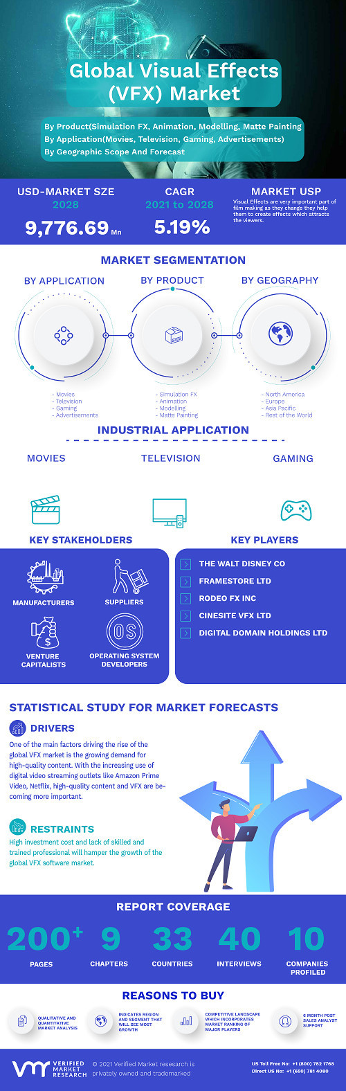 News Visual Effects (VFX) Market Size By Product(Simulation FX, Animation, Modelling, Matte Painting and Compositing), By Application(Movies, Television, Gaming, Advertisements and Others) smithjenny22119 944 views Visual Effects (VFX) Market was valued at USD 6,793.60 Million in 2020 and is projected to reach USD 9,776.69 Million by 2028, growing at a CAGR of 5.19 % from 2021 to 2028. « Previous Visual Effects (VFX) Market