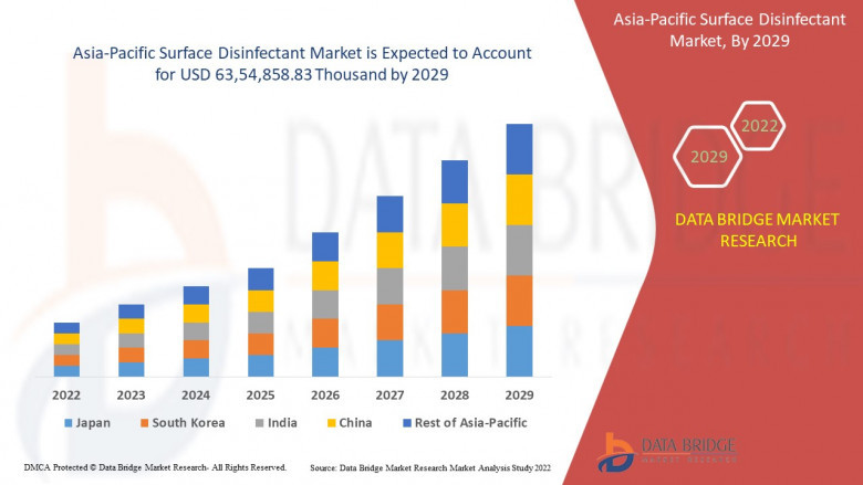 Asia-Pacific surface disinfectant market is expected to gain market growth in the forecast period of 2022 to 2029. Data Bridge Market Research analyses that the market is growing at a CAGR of 7.7% in the forecast period of 2022 to 2029 and expected to reach USD 63,54,858.83 thousand by 2029.