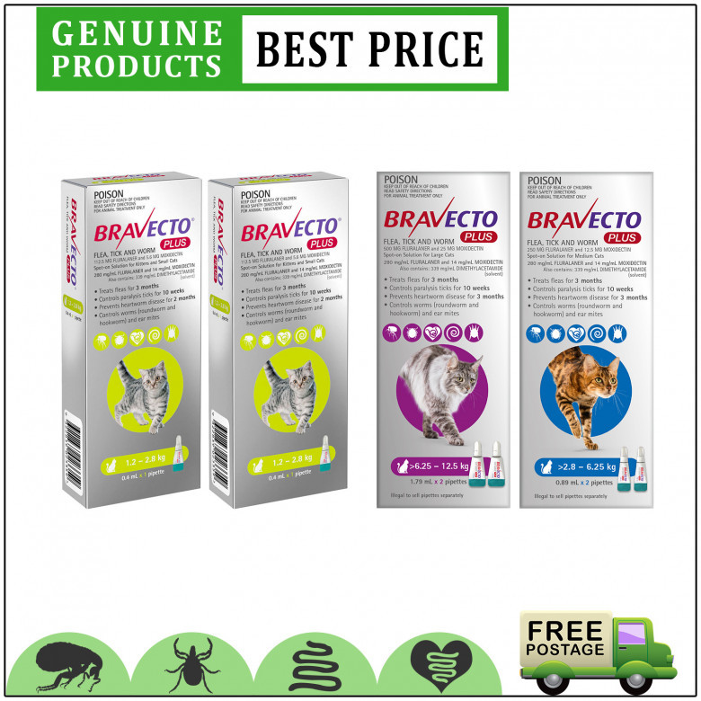 An excellent treatment for fleas, paralysis ticks, gastrointestinal nematodes, and heartworm prevention in cats is Bravecto Plus for Cat. Ear mites can be treated with the topical medication as well. For three months against fleas, ten weeks against paralysis ticks, and two months against heartworms, Bravecto Plus offers protection. We provide free shipping throughout Australia as well as low prices.