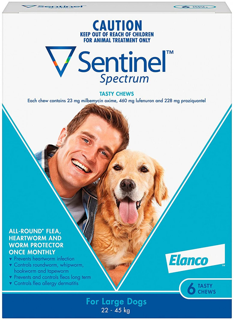 Sentinel Spectrum is a meaty chewable tablet used in dogs to prevent heartworm disease, to prevent and control fleas, and to control roundworm, whipworm, hookworm, and tapeworms. We offer the most competitive pricing and the quickest delivery on the market.
