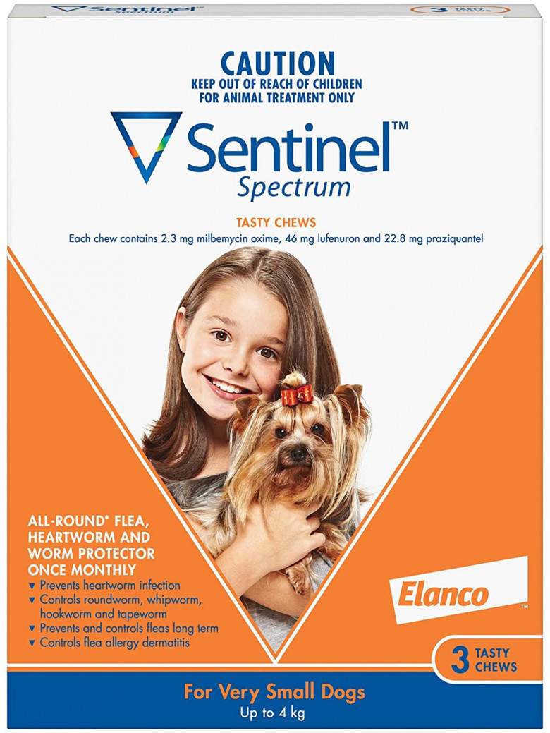 Sentinel Spectrum is a meaty chewable tablet used in dogs to prevent heartworm disease, to prevent and control fleas, and to control roundworm, whipworm, hookworm, and tapeworms. We offer the most competitive pricing and the quickest delivery on the market.