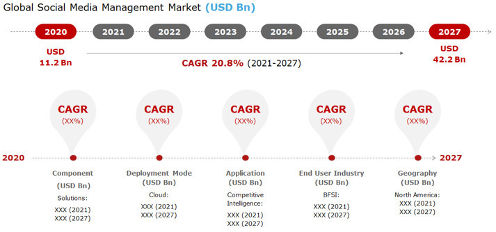 The Social Media Management Market size was valued at US$ 11.2 Bn in 2020 and is expected to grow at a compound annual growth rate (CAGR) of 20.8% for the forecast period ending 2027 reaching a Market value of US$ 42.2 Bn