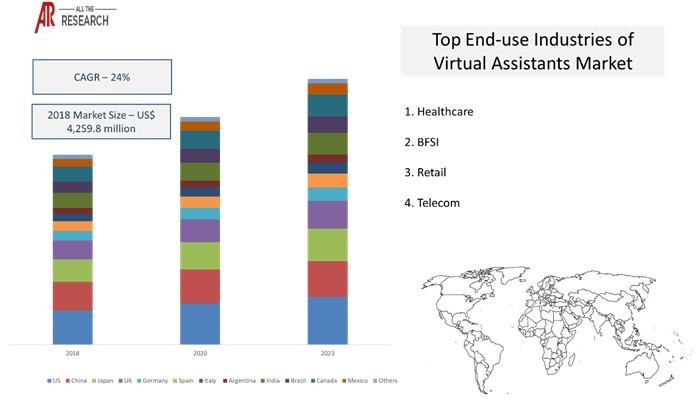 The Virtual Assistants Market size was valued at US$ 4259.8 Mn in 2018 and is expected to grow at a compound annual growth rate (CAGR) of 24% for the forecast period ending 2026 reaching a Market value of US$ XX Mn.